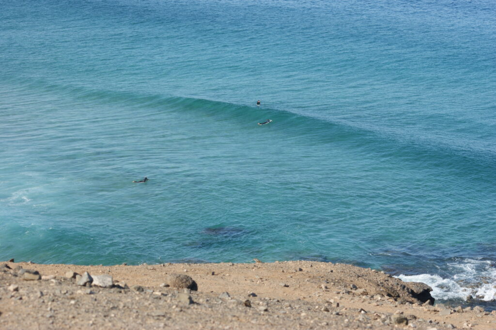 Disfrutamos de menos viento, olas preciosas y una temperatura del aire de unos 25 °C y del agua de 18 °C.
